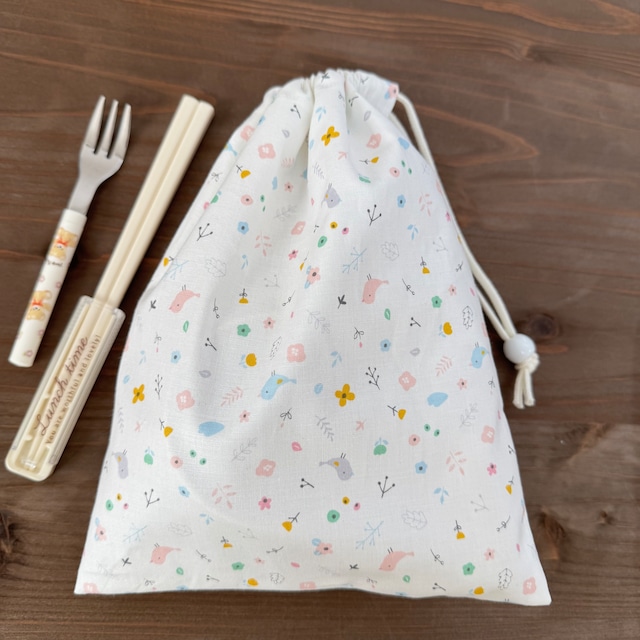 給食袋に最適 25×20cm 巾着袋 _________ 優しい白地に やわらかい雰囲気の小鳥さんとお花柄 _________ シンプルかわいい _________ 産まれたての可愛さをもつ女の子むけ _________ ◾️サイズ 約 縦25×横20cm _________ ひも1本タイプ _________ アクリルひも☆オフホワイト ループエンド☆ホワイト _________ ◾️生地の品質、厚さ やや薄め やわらかく丈夫な生地 綿100% _________ ◾️お手入れ 洗濯機で何度も洗えます ※乾燥機の使用により生地が痛んだり、縮んだりしますので、お控えください。 _________ 再販可能 _________ ◾️注意事項 複数作製している為、柄の配置は異なります。 現物と同じ様になるよう注意して撮影していますが、若干色合いが異なる場合がございます。また、スマホ、PCなどデバイスによっても見え方が変わります。 画像6枚目以降は参考画像です。 数量1につき給食袋1枚です。 お皿やお箸などはつきません