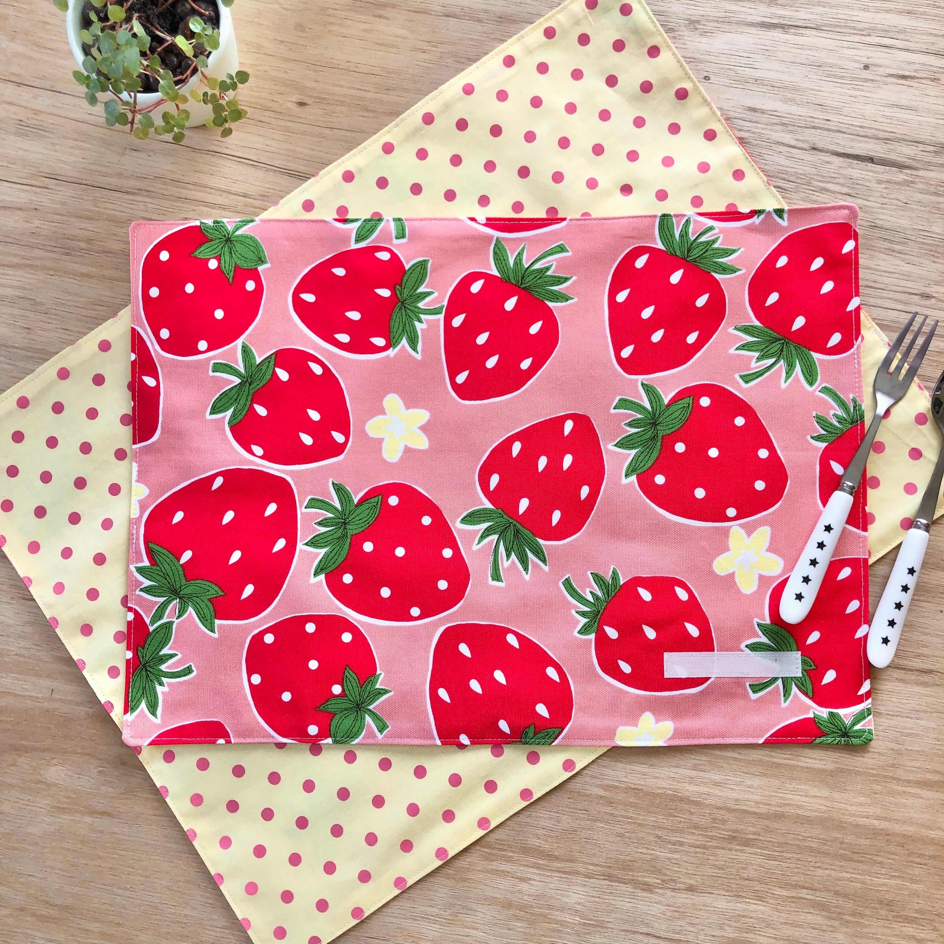 普通のイチゴの2〜4倍くらいありそうな大きさの苺柄です。裏地は薄いイエロー地に控えめなピンクの水玉です。ランチョンマットを広げた時に思わず『かわいー♡』と言いたくなってしまう、可愛さです♡