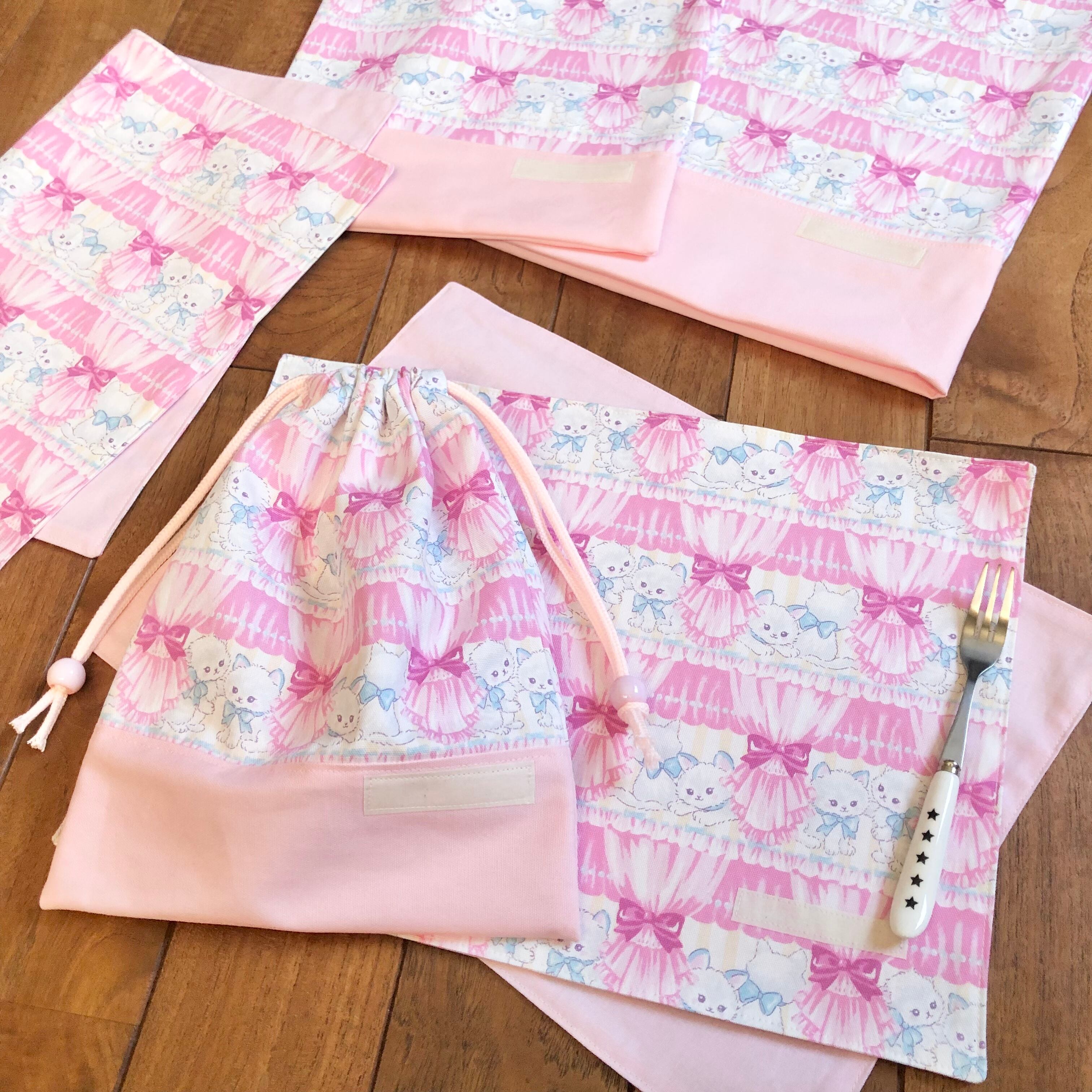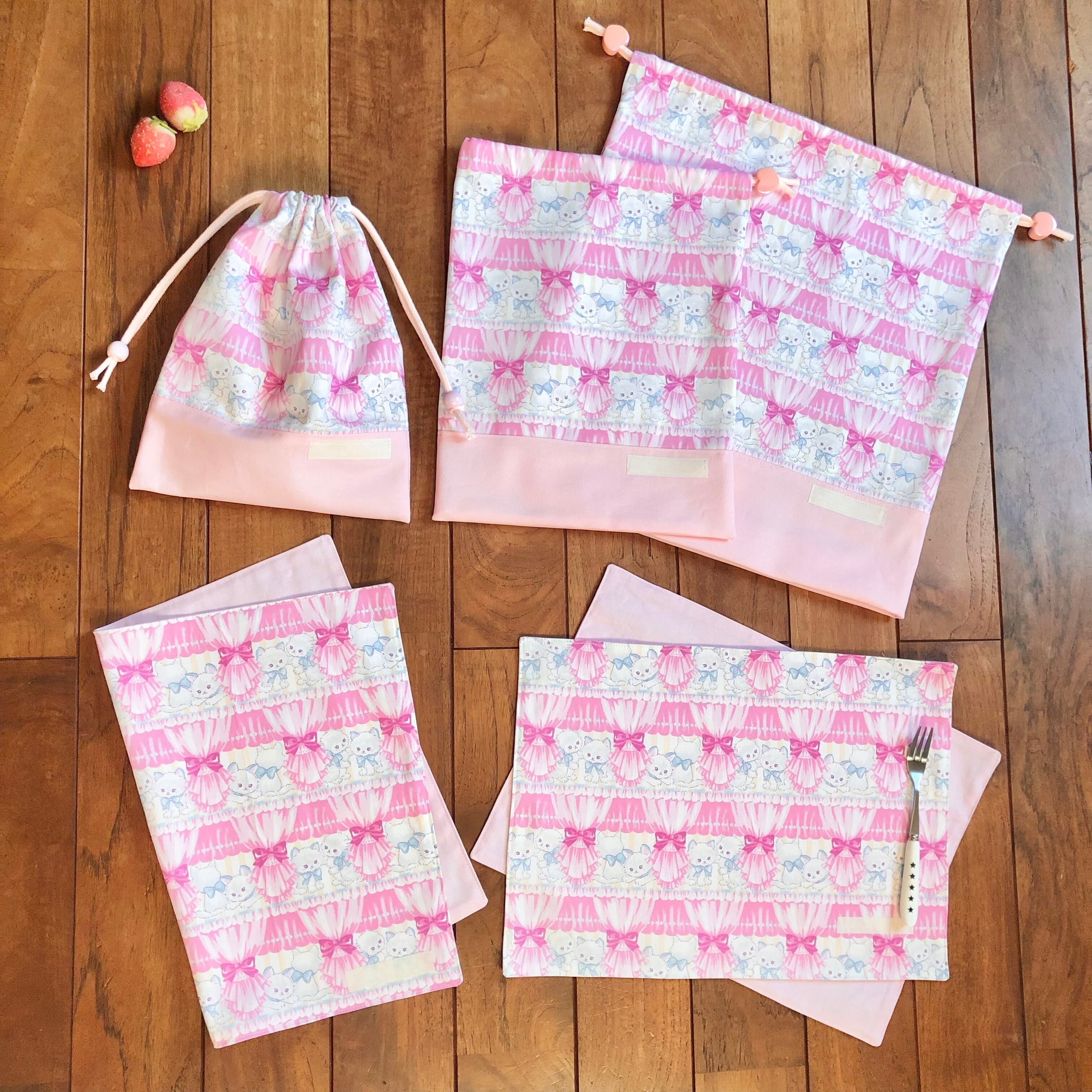 ランチョンマット☆30×40cmピンク【カーテンキャット】★RM2.55 裏地付き 女の子 ネコ|通園通学用のかわいい巾着袋や入園オーダーHoshizora☆ほしぞら