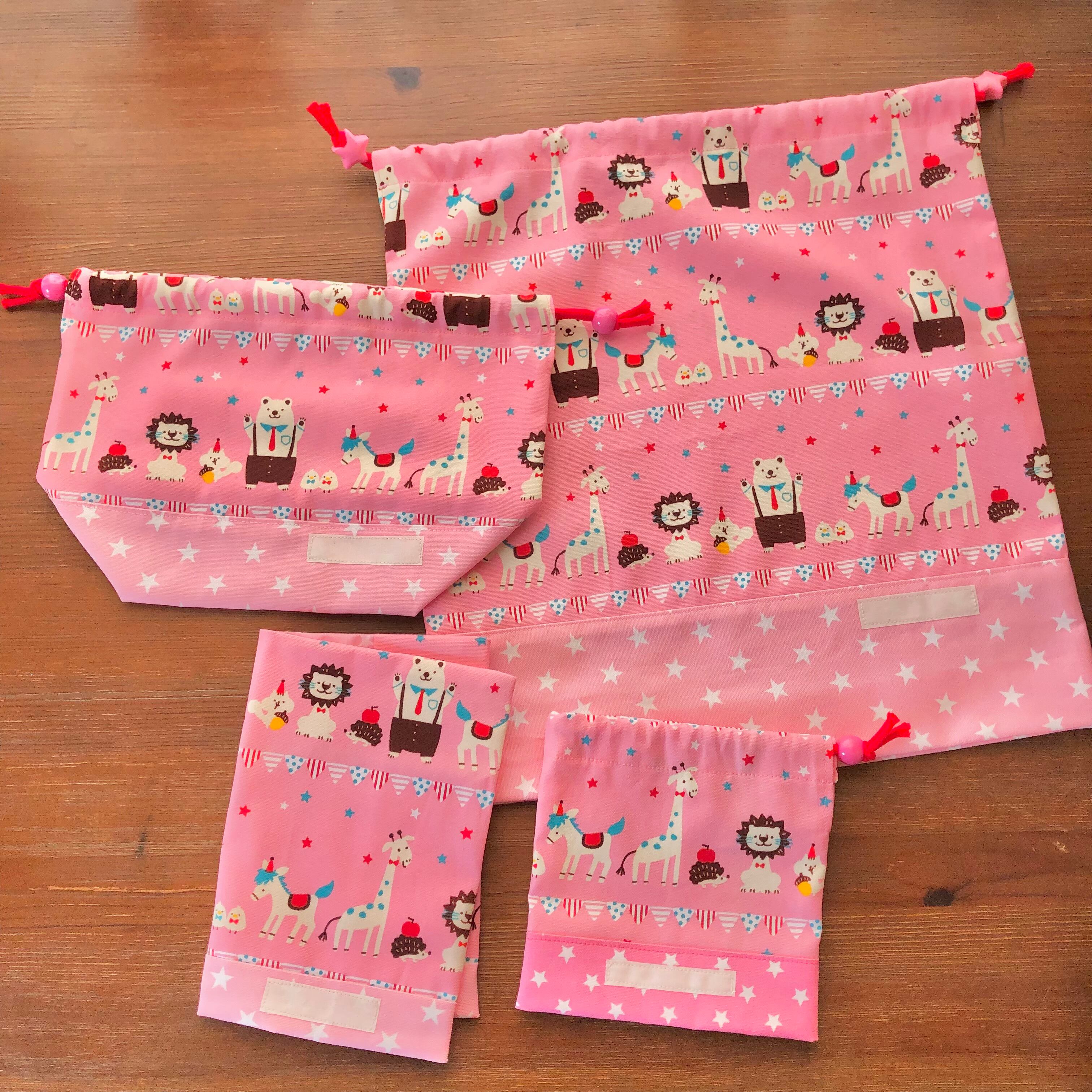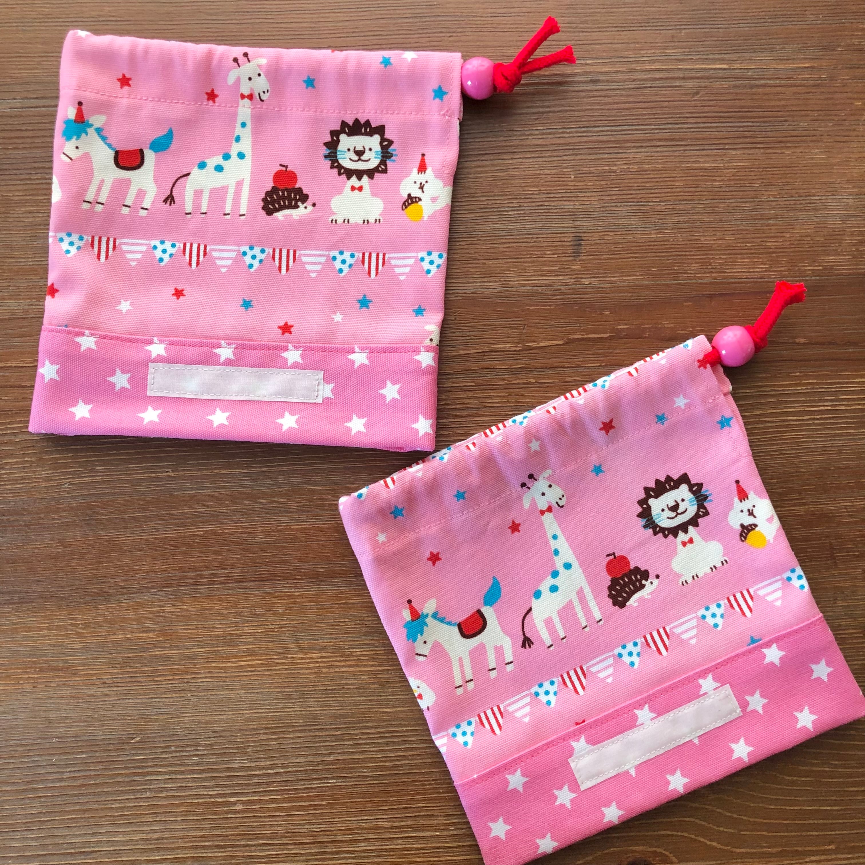 巾着袋(コップ袋)☆14×15cmマチ9cm ピンク【どうぶつ柄】 ★KP.45 動物 アニマル ライオン キリン 馬 星 女の子 |通園通学用のかわいい巾着袋や入園オーダーHoshizora☆ほしぞら
